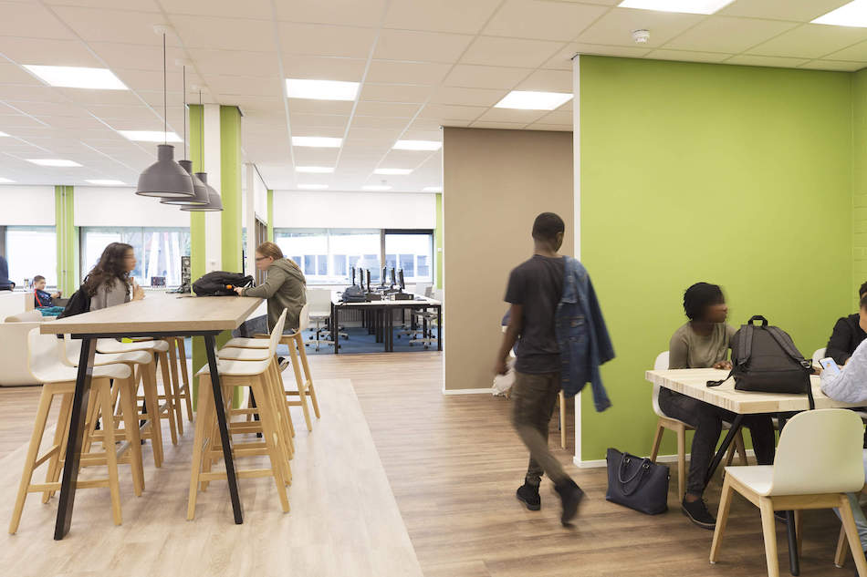 De inrichting van de Nieuwe Havo past nu weer bij hun visie: leren door te doen, initiatief nemen en samenwerken. De focus in de mediatheek ligt niet meer alleen op boeken en lezen, je kunt er studeren, chillen, samenwerken in projectruimtes en informatie zoeken. Op de begane grond is het oorspronkelijke kernpunt in ere hersteld: het kunstwerk van Han Goan Lim. De aula heeft een tribune voor het raam, waarop je kunt hangen maar ook je telefoon op kunt laden. Het studielandschap wordt veel gebruikt om te chillen.