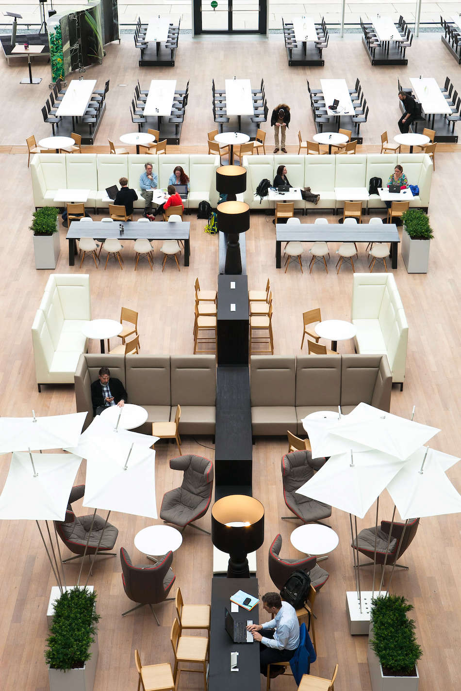 Het hoofdkantoor van Westraven heeft een prachtige locatie voor het restaurant, aan het water en volop daglicht. Het werd gebruikt tussen 12 en 2. Tegelijkertijd misten medewerkers van andere locaties een plek waar zij konden werken voor of na een vergadering, zonder op de verdiepingen te moeten zoeken naar een plek. De flexlounge is een mooie bekroning van de optimalisatieslag van WorkWire voor RWS, en zit vol vanaf dag één.